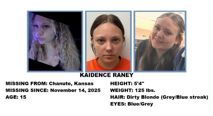Police say 15-year-old Kaidence Raney has been missing from her Chanute home since Friday, November 14. Raney is described as being 5 feet four inches tall and 125 pounds with blonde hair with a grey/blue streak. She is also said to have both sides of her nose pierced and a bruise around one eye due to a recent piercing attempt. Kaidence is known to have mental health concerns and was last seen in the Coffeyville area.