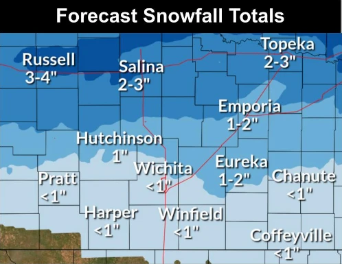 Montgomery County and areas to the south will likely see less than an inch of snow. Accumulation is expected north of Eureka, where there could be between 1 and 2 inches of snow. North central Kansas is expected to receive up to 4 inches.