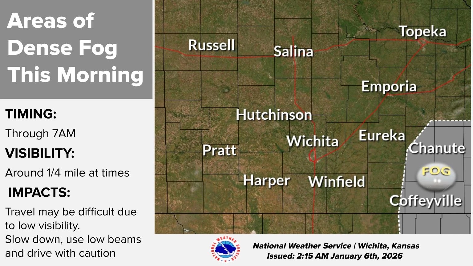 Dense fog advisory extended through 8 a.m. for Wilson, Neosho, Montgomery and Labette Counties.