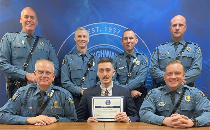 Photo courtesy Kansas Highway Patrol. Roark is joined by KHP Captain Drennan, Master Trooper Bales, and Lieutenants O’Hara, Woods, Markham, and Sell for a signing to commemorate his commitment to joining the Kansas Highway Patrol.