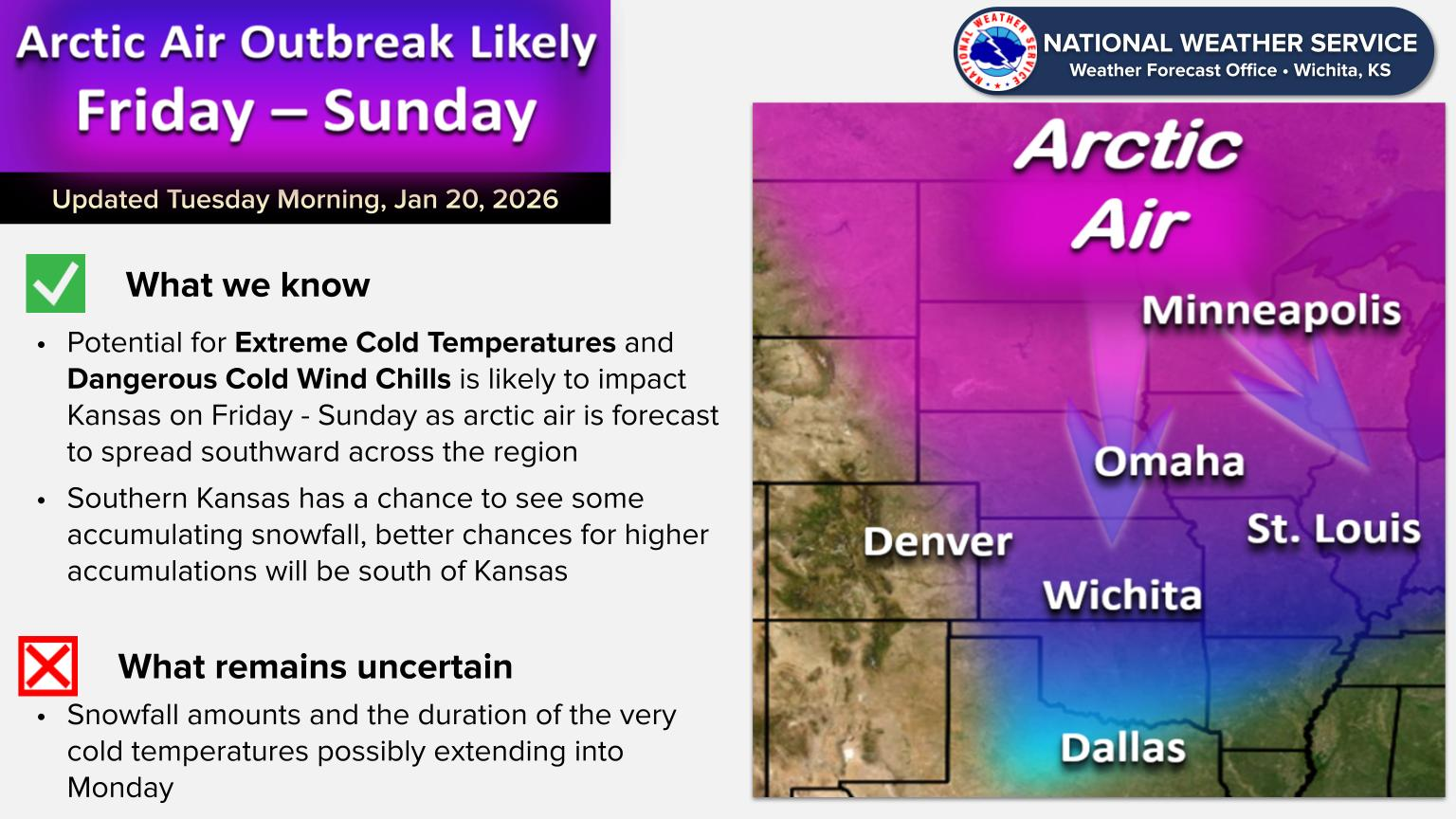Snowfall is also possible with this storm, with the best chances being in northeast Oklahoma, although southern Kansas and Missouri and northwest Arkansas will also see the possibility of a winter storm. Confidence continues to increase in the potential for minor to moderate winter weather for portions of northeast Oklahoma. Snowfall amounts and duration of the cold temperatures extending into Monday remain uncertain at this time. Stay tuned for additional updates as the weekend approaches.