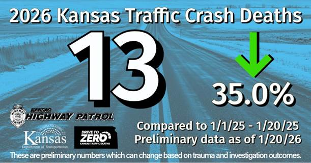 So far in 2026, the total number of fatal traffic accidents is down 35% from last year. According to the Kansas Highway Patrol, 13 people have lost their lives in traffic crashes so far in 2026 as compared to 17 deaths during the same period in 2025. K-H-P reminds Kansans to buckle up, drive sober, obey posted speed limits and avoid distractions when behind the wheel.