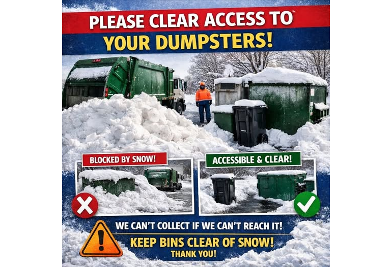 With the recent winter storm and the following melting and freezing, ice and piles of snow around dumpsters and polycarts make it difficult for sanitation crews to do their jobs. In order to ensure prompt and efficient trash pick up, the City is asking residents to make sure their dumpsters and carts are easy to access.