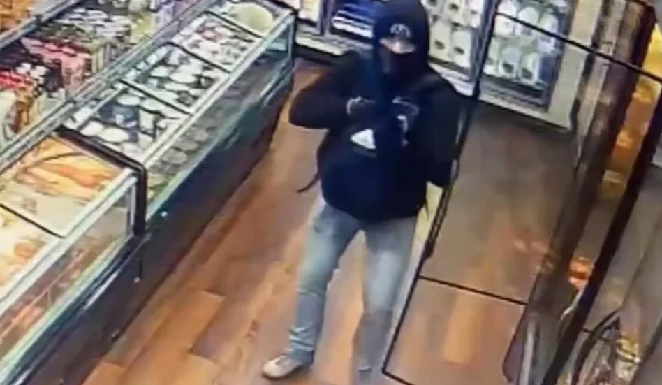 The thief was caught on video camera and was inside the store for only a few minutes. The suspect is described as a white male of medium build. He was wearing a dark, hooded sweatshirt, light colored pants, and light colored Adidas shoes. He was wearing a mask with distinct blue lettering and carrying a blue Adidas backpack.