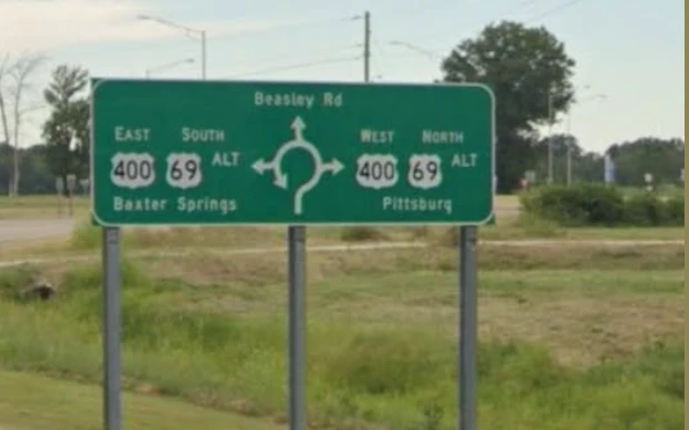 The damaged KDOT sign is located neat the Riverton roundabout on Route 66, just east of US-400. Sheriff's deputies have contacted an elderly man who is believed to be the driver who struck the sign.
