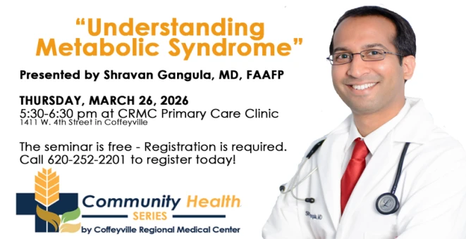 The seminar will be held on Thursday, March 26 from 5:30 to 6:30pm at the CRMC Medical Group Primary Care Clinic. The session is free to attend but registration is required. Space is limited. To sign up, call 620-252-2201.