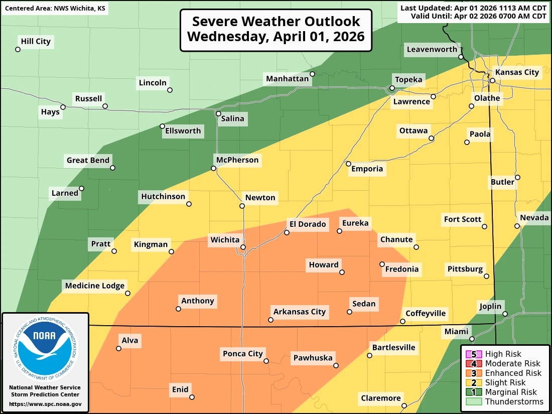 The enhanced risk area from the Storm Prediction Center now extends more into southeast Kansas and northeast Oklahoma, with Montgomery, Wilson and northern Washington County now included on the edge of the level 3 out of 5 risk area for severe weather. Stay tuned for severe weather coverage tonight if needed.