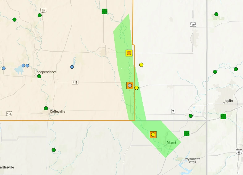 According to the National Water Prediction Service, a flood warning will be in effect for the Neosho River in Neosho and Labette counties through this evening and Ottawa County Oklahoma through tomorrow afternoon.