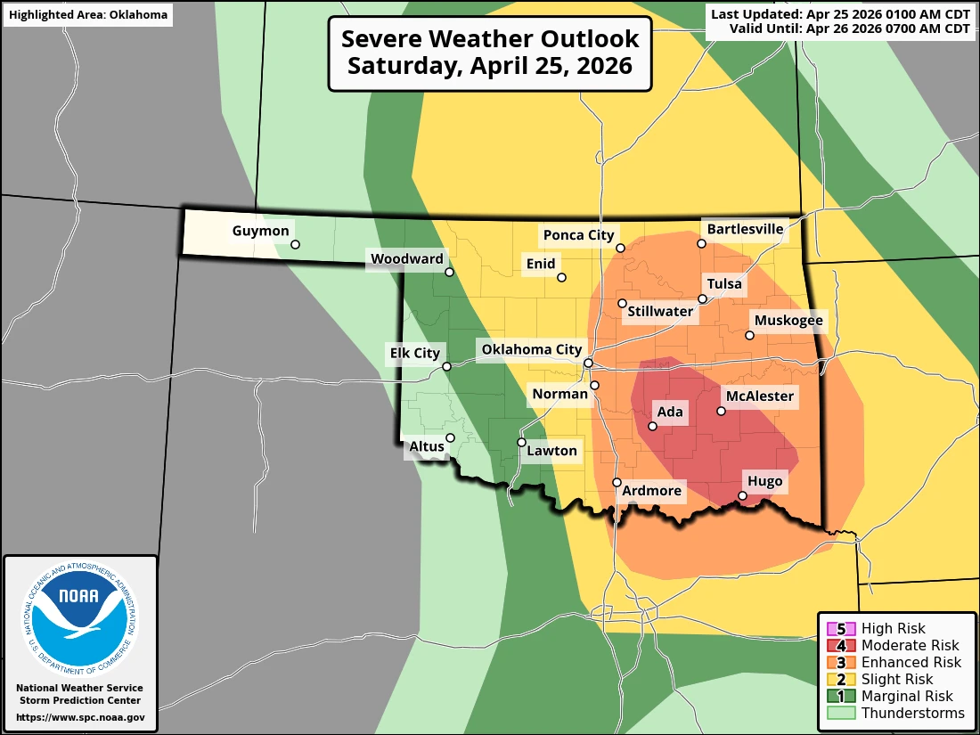 For Saturday, the best chances for severe weather will be south of Tulsa, with all modes of severe weather possible. Much of the KGGF listening area, including southeast Kansas, has at least a “slight” risk of severe weather. The strongest storms are mainly possible between 4 p.m. and midnight, with timing expected a little later for northeast Oklahoma.
