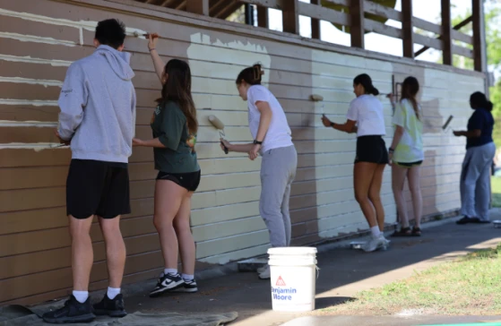 Photo: ICC Students paint the bleachers at the Independence tennis courts. Courtesy Love Independence