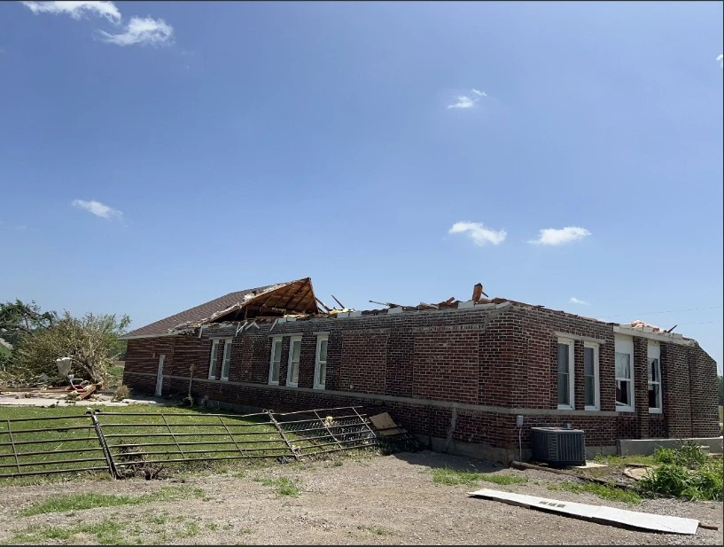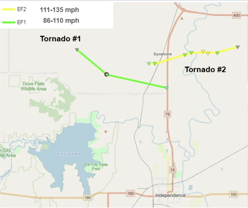 After completing their damage assessment on Monday, meteorologists from the Wichita Office of the National Weather Service say the first tornado was an EF1 with peak winds around 90 mph. It started just west of Sycamore and tracked to the southeast between 6:55 and 7:13, with a length of just over 5 miles and a max width of 30 yards. This tornado damaged farm outbuildings, including small grain bins, but did not cause any injuries.