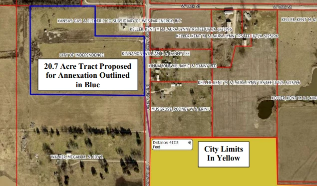 Image shows the Independence City Limits in yellow and the area to be annexed outlined in blue